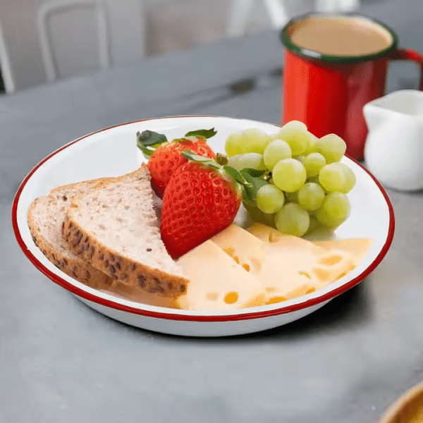 24cm Large Custom Decal logo White Red Rim Tableware Enamelware Dinner Round Metal Enamel Deep Dinner Serving Rice Dish Plate