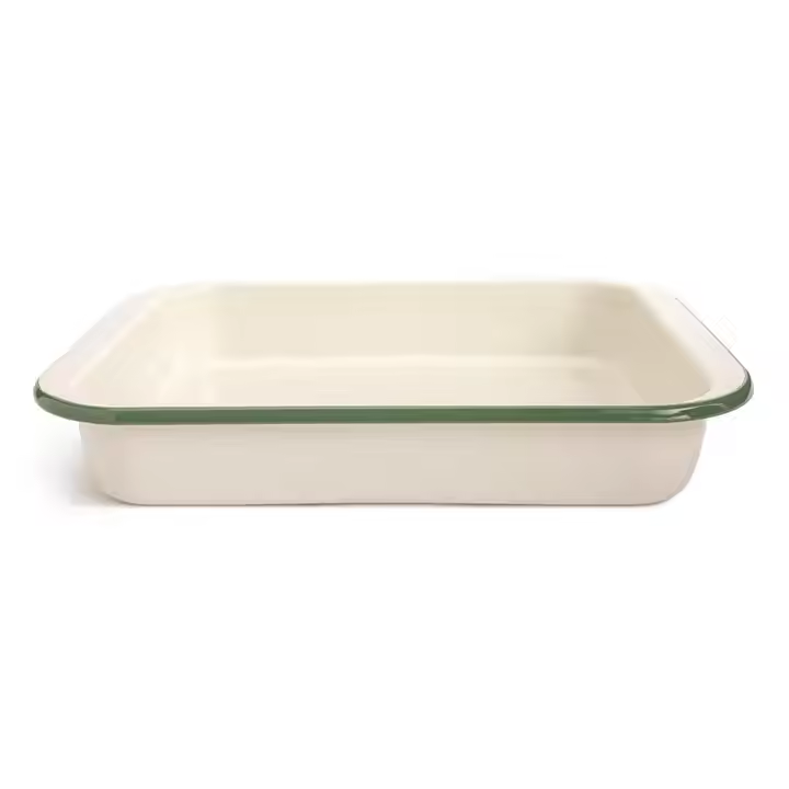 27cm Rectangle Custom logo Print Kitchenware Home Restaurant Use Bread Fruit Serving Metal Enamel Baking Tray with Blue Roll Rim
